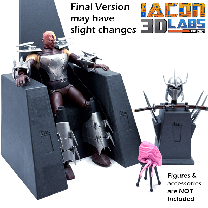 At the center is the iconic Shredder Throne, scaled perfectly for the 2012 Shredder figure. Due to known articulation limitations, Shredder can’t pull off a full seated pose—so we engineered the throne to work with the figure, not against it, balancing stability, display presence, and show-accurate style as closely as possible to the on-screen reference.